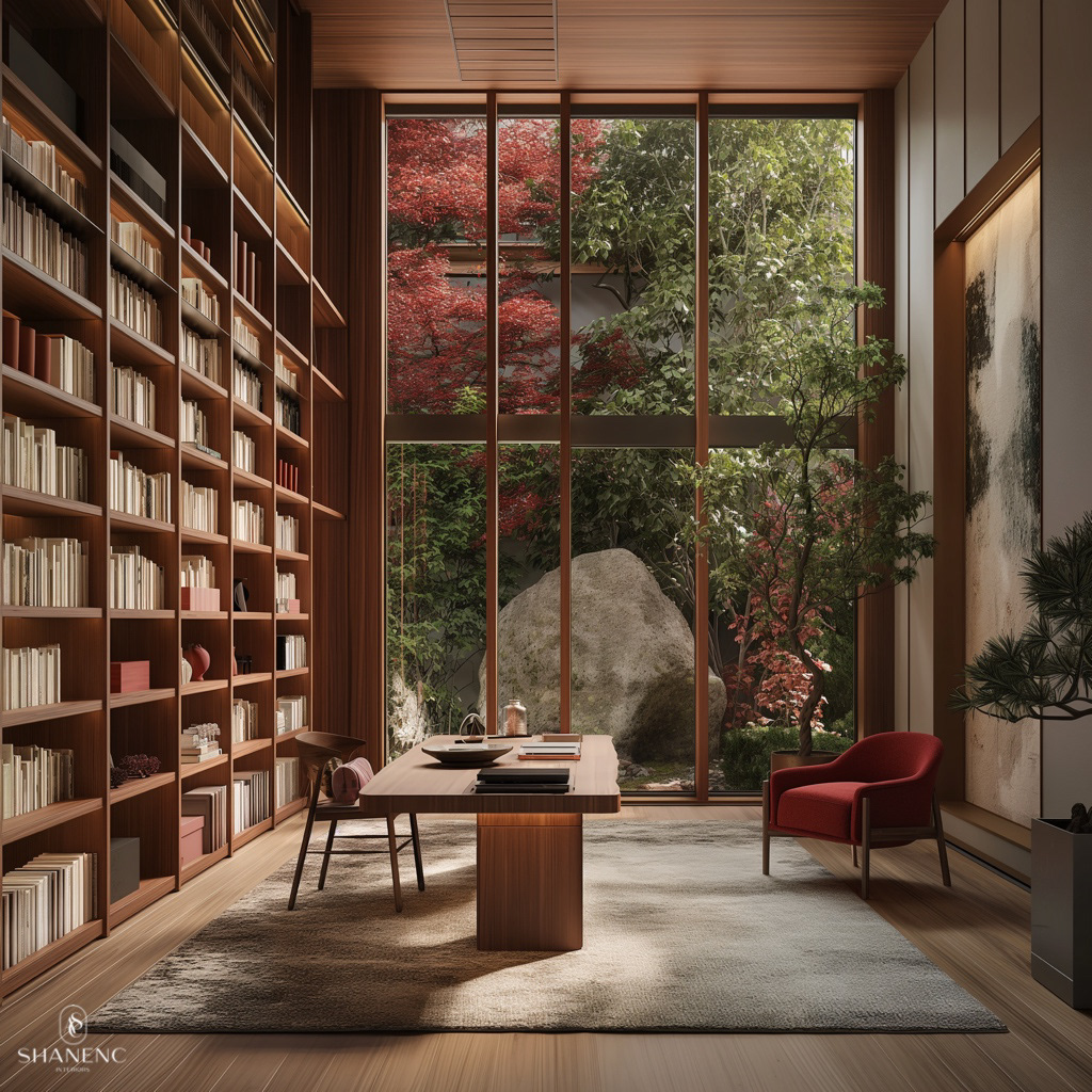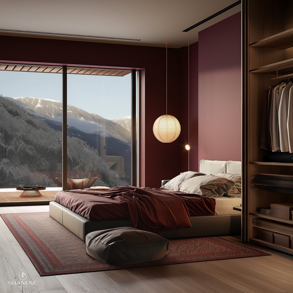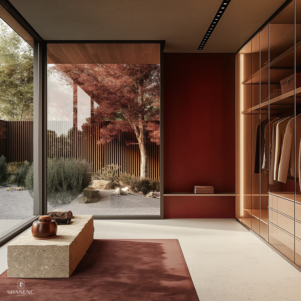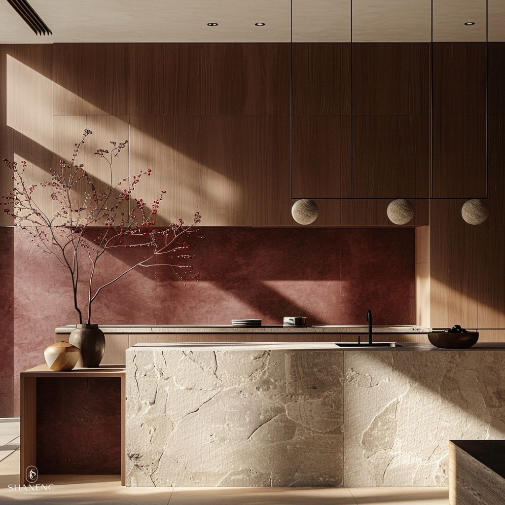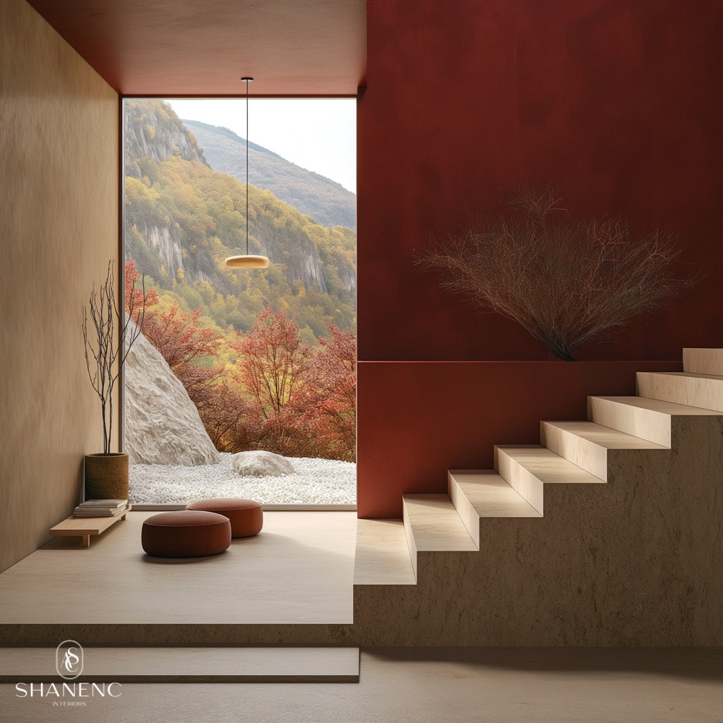 Conceptual Design — This Japandi-inspired home blends the tranquility of Japanese minimalism with the warmth of Scandinavian design. The spaces are defined by clean lines, natural textures, and a calming palette of earthy reds, soft woods, and stone elements. Ceilings feature subtle wooden slats and organic forms that enhance the serene ambiance, while large windows frame stunning views of nature, seamlessly connecting the indoors with the outdoors. The material palette emphasizes simplicity, with warm wood finishes, textured plaster walls, and handcrafted accents adding depth and character. Every element is thoughtfully placed to evoke harmony, balance, and timeless elegance.