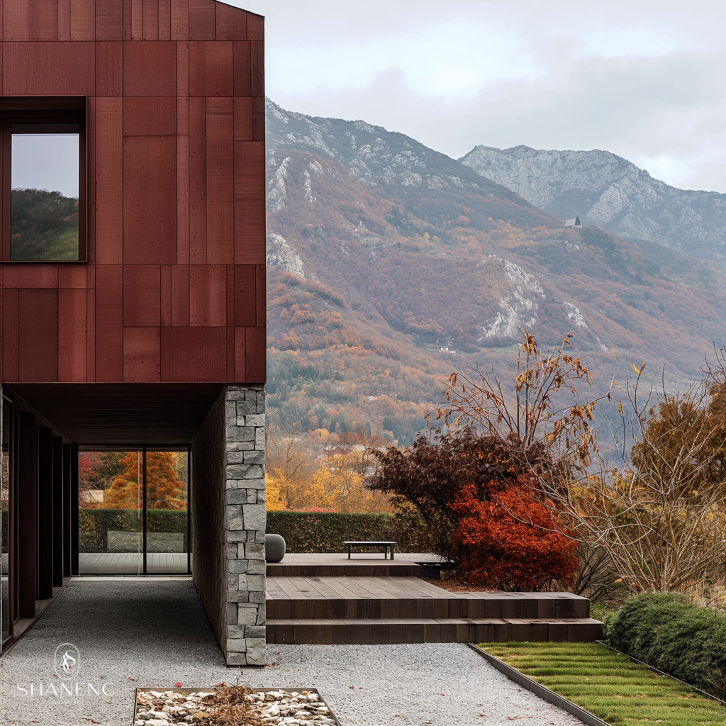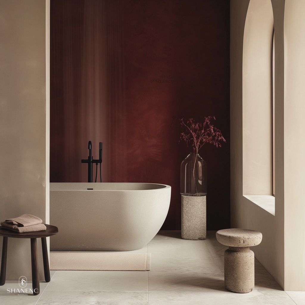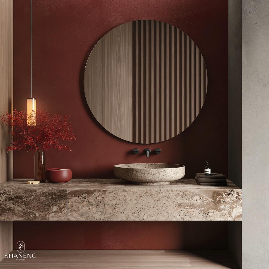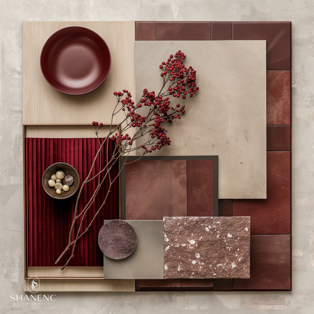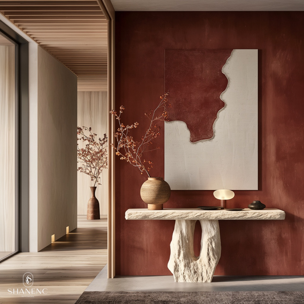 Conceptual Design — This Japandi-inspired home blends the tranquility of Japanese minimalism with the warmth of Scandinavian design. The spaces are defined by clean lines, natural textures, and a calming palette of earthy reds, soft woods, and stone elements. Ceilings feature subtle wooden slats and organic forms that enhance the serene ambiance, while large windows frame stunning views of nature, seamlessly connecting the indoors with the outdoors. The material palette emphasizes simplicity, with warm wood finishes, textured plaster walls, and handcrafted accents adding depth and character. Every element is thoughtfully placed to evoke harmony, balance, and timeless elegance.