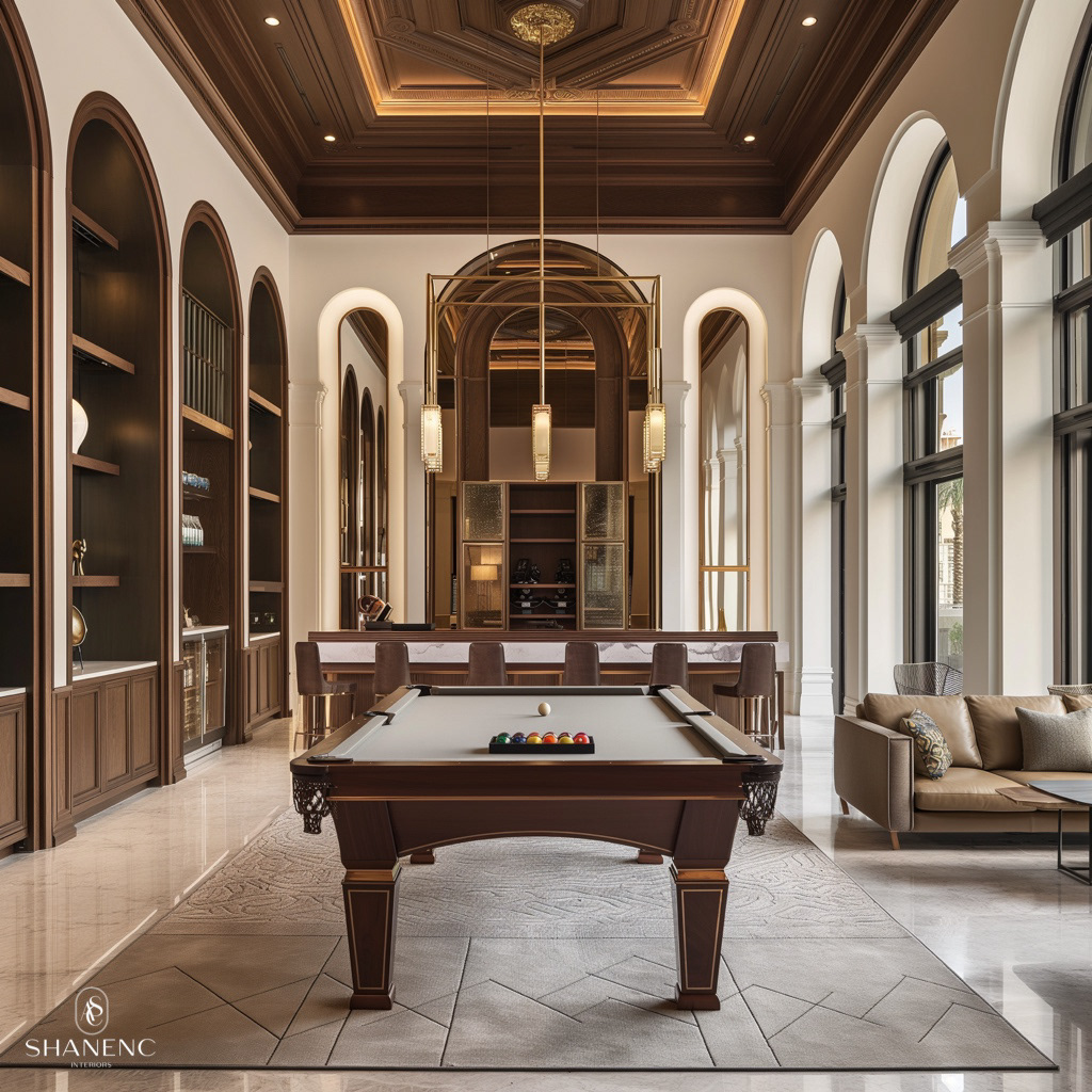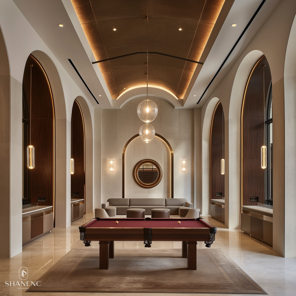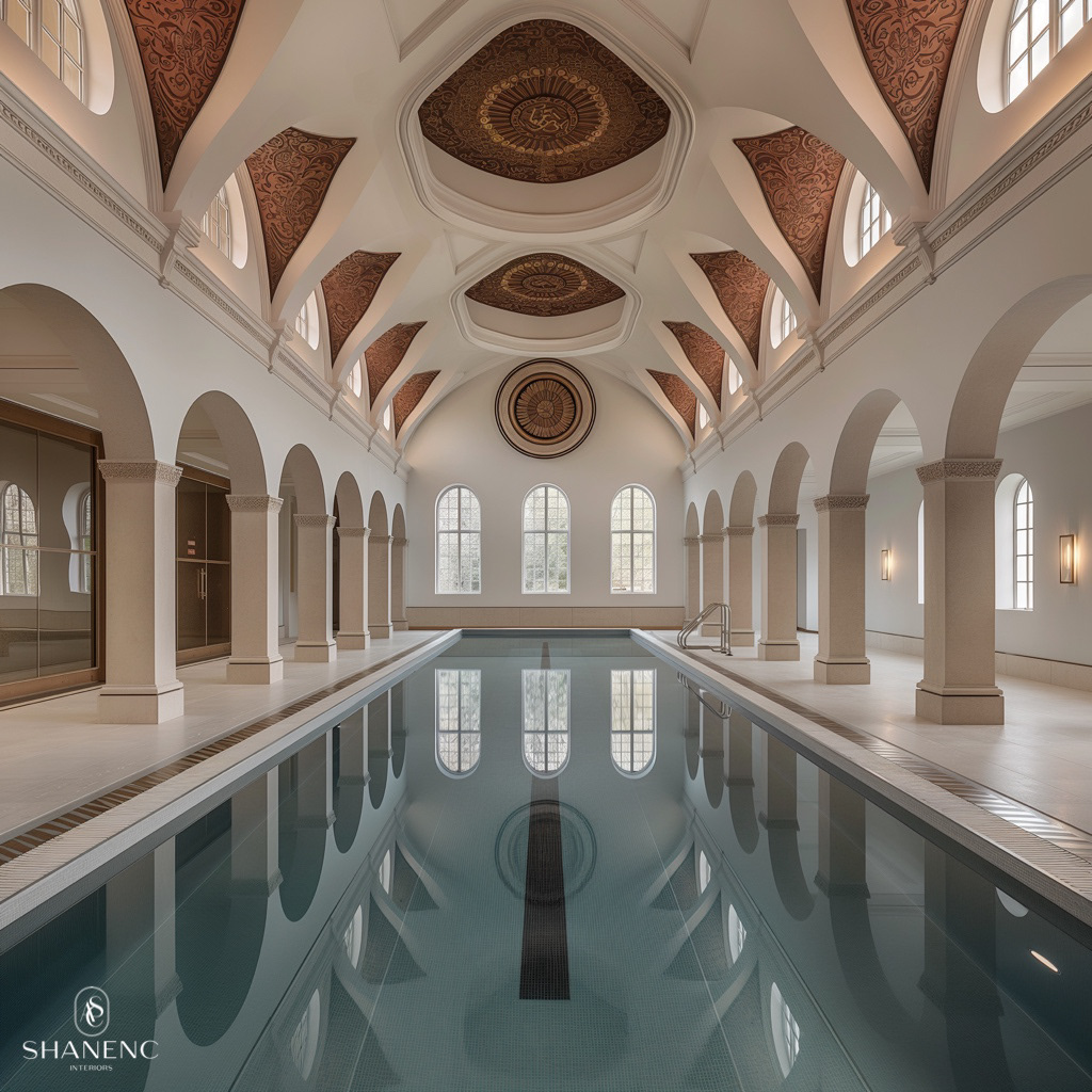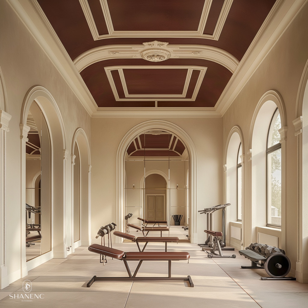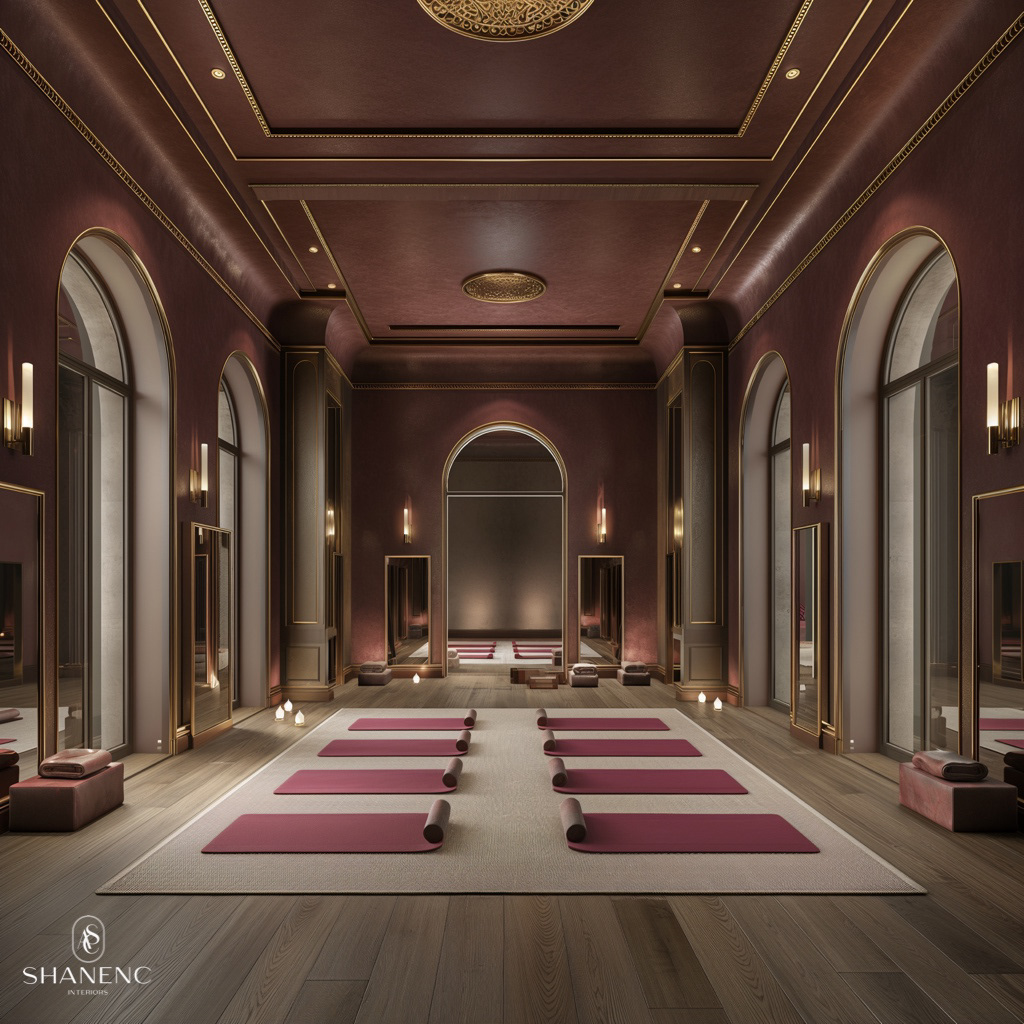 Conceptual Design — The design combines classic elegance with modern comfort. Vaulted ceilings featuring intricate moldings, rich wood finishes, and polished stone floors create a timeless aesthetic. Warm lighting and soft materials contribute to a cozy, luxurious atmosphere. Every area, from the yoga studio to the lounge, is thoughtfully designed for relaxation and style.