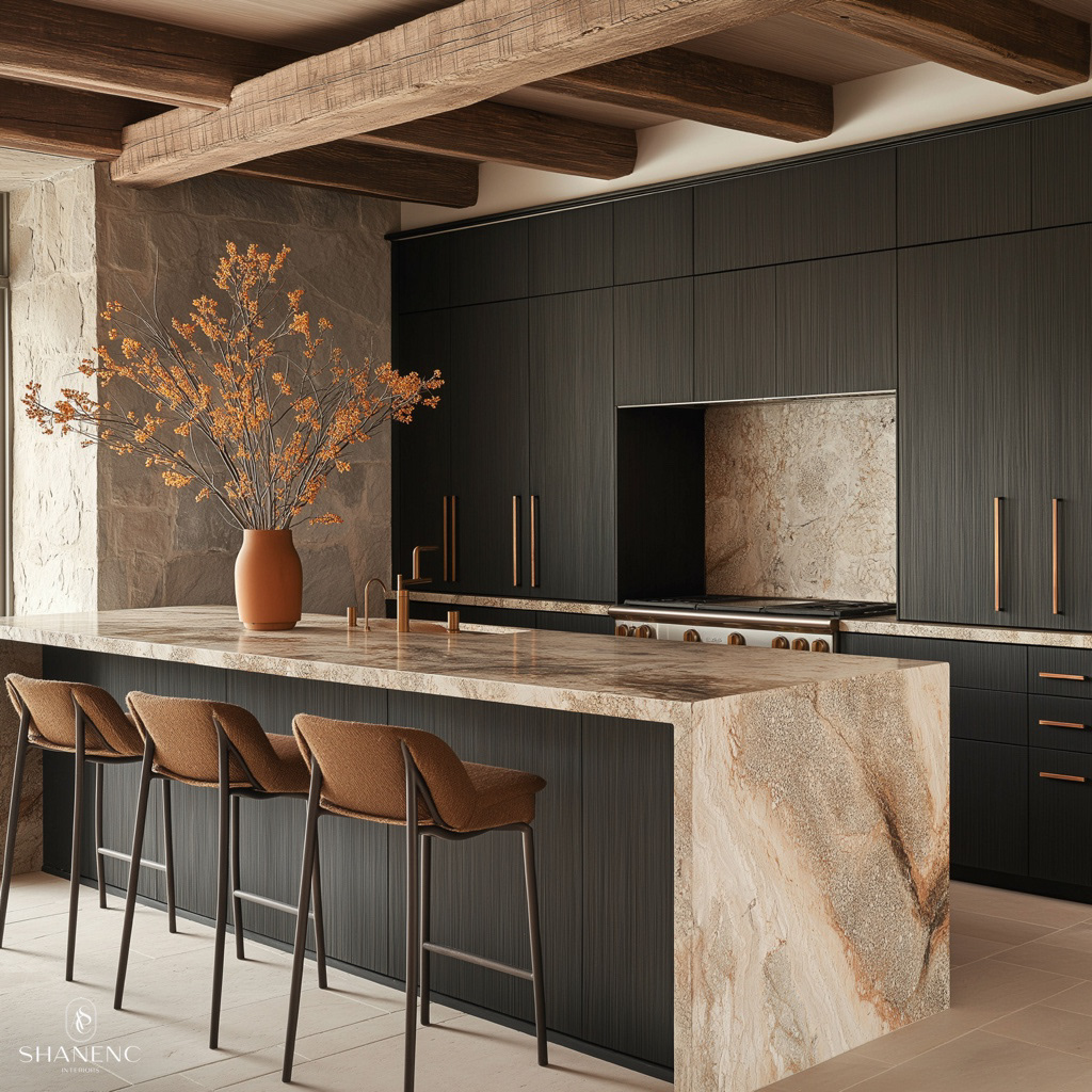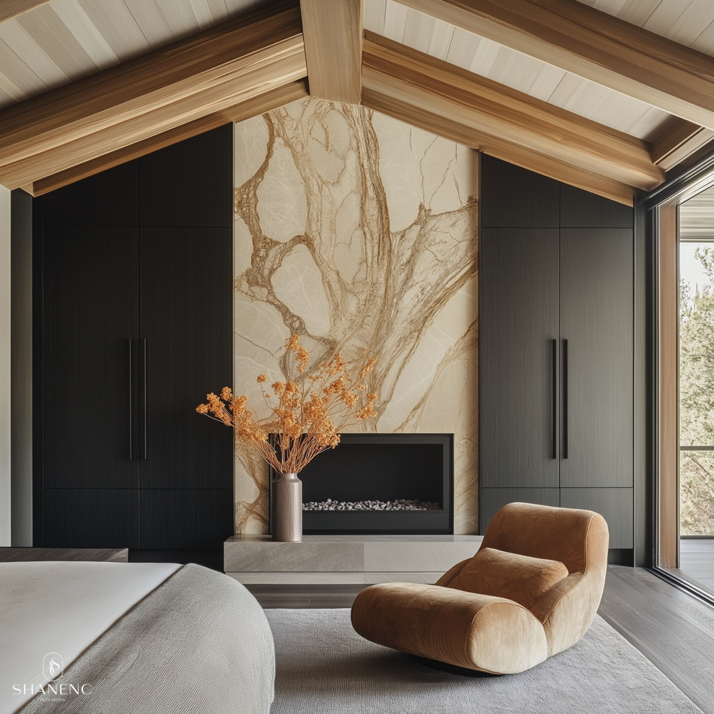 Conceptual Design — Inspired by Muskoka Living. This home beautifully combines modern interiors with the natural beauty of its surroundings. It features rich wooden beams, textured stone accents, and warm earthy tones, all of which capture the essence of lakeside living. Large windows allow ample natural light to stream in and frame tranquil views, creating a harmonious retreat that blends comfort with sophistication.