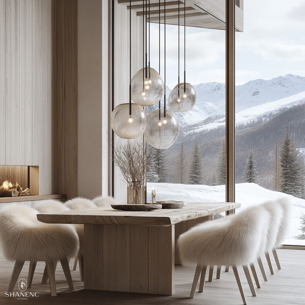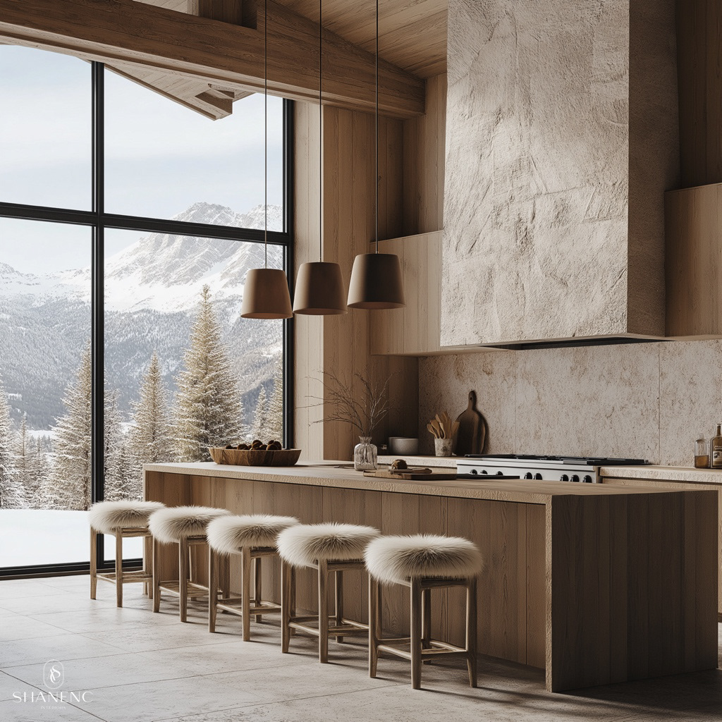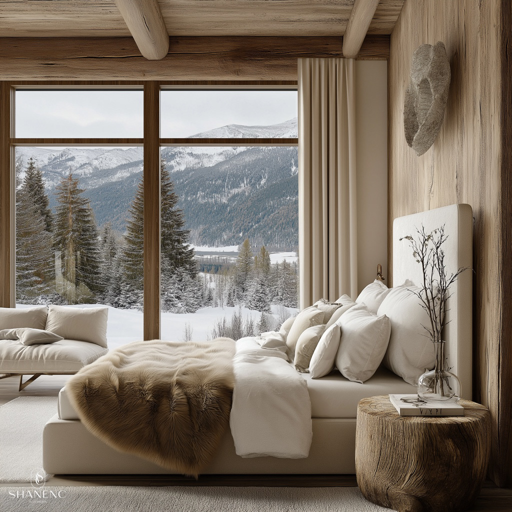 Conceptual Design — This chalet-inspired design merges rustic warmth with refined luxury. The timber ceilings and exposed beams create a grand yet cozy atmosphere, while natural materials such as reclaimed wood, stone, and fur add texture and charm. Large windows are a key feature, showcasing stunning mountain views and seamlessly connecting the interior to the breathtaking surroundings.