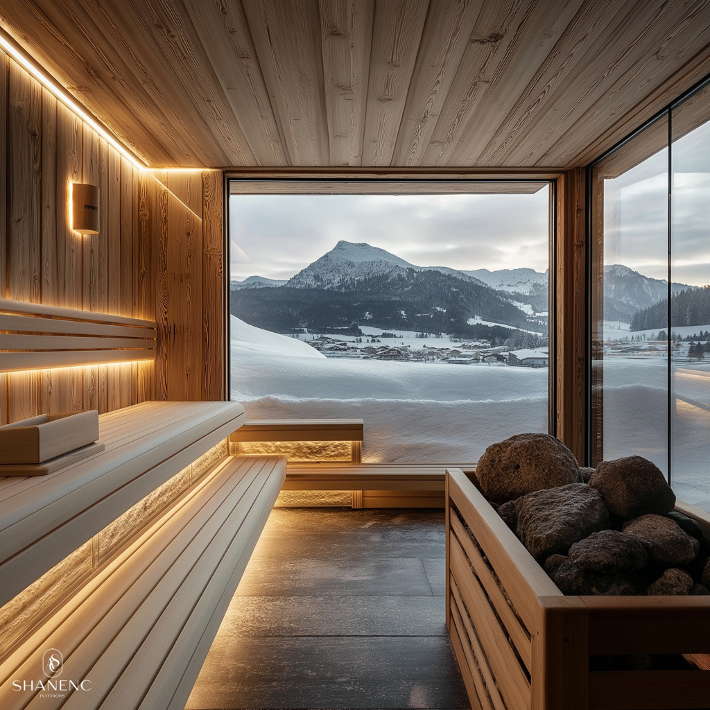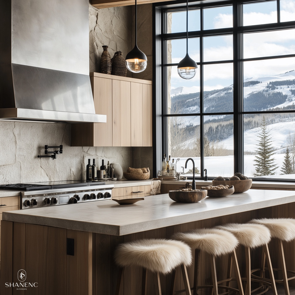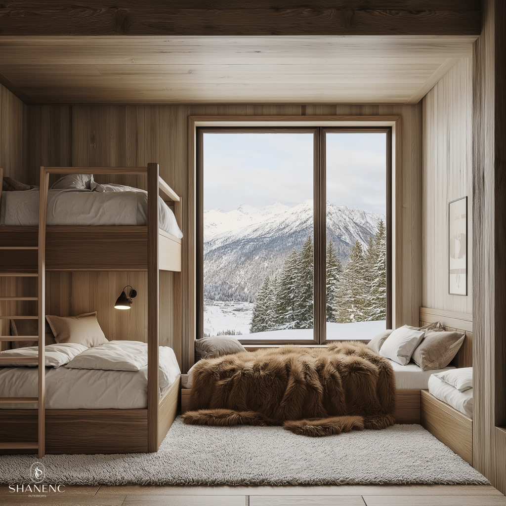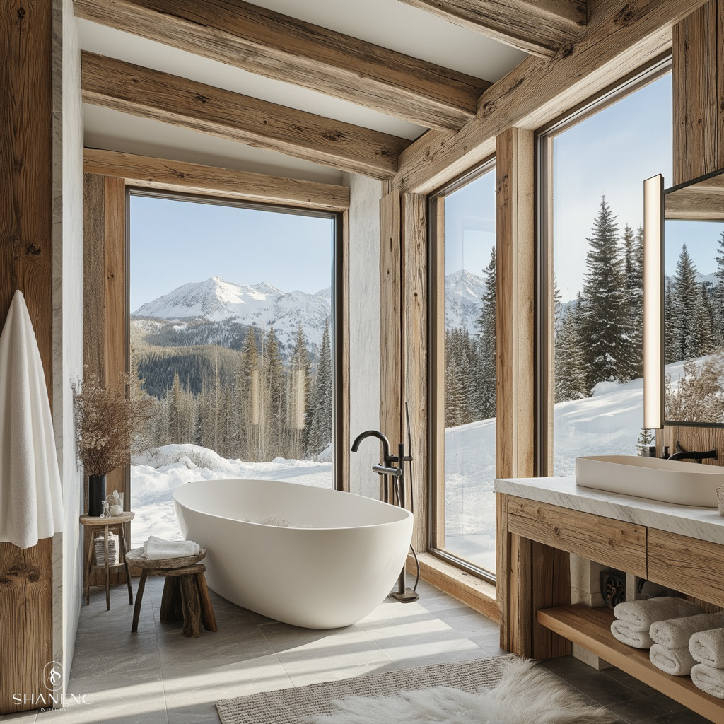 Conceptual Design — This chalet-inspired design merges rustic warmth with refined luxury. The timber ceilings and exposed beams create a grand yet cozy atmosphere, while natural materials such as reclaimed wood, stone, and fur add texture and charm. Large windows are a key feature, showcasing stunning mountain views and seamlessly connecting the interior to the breathtaking surroundings.