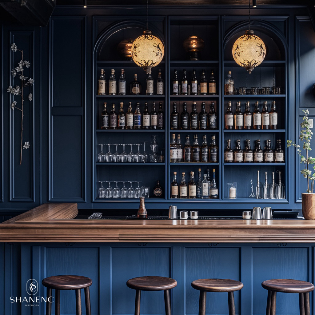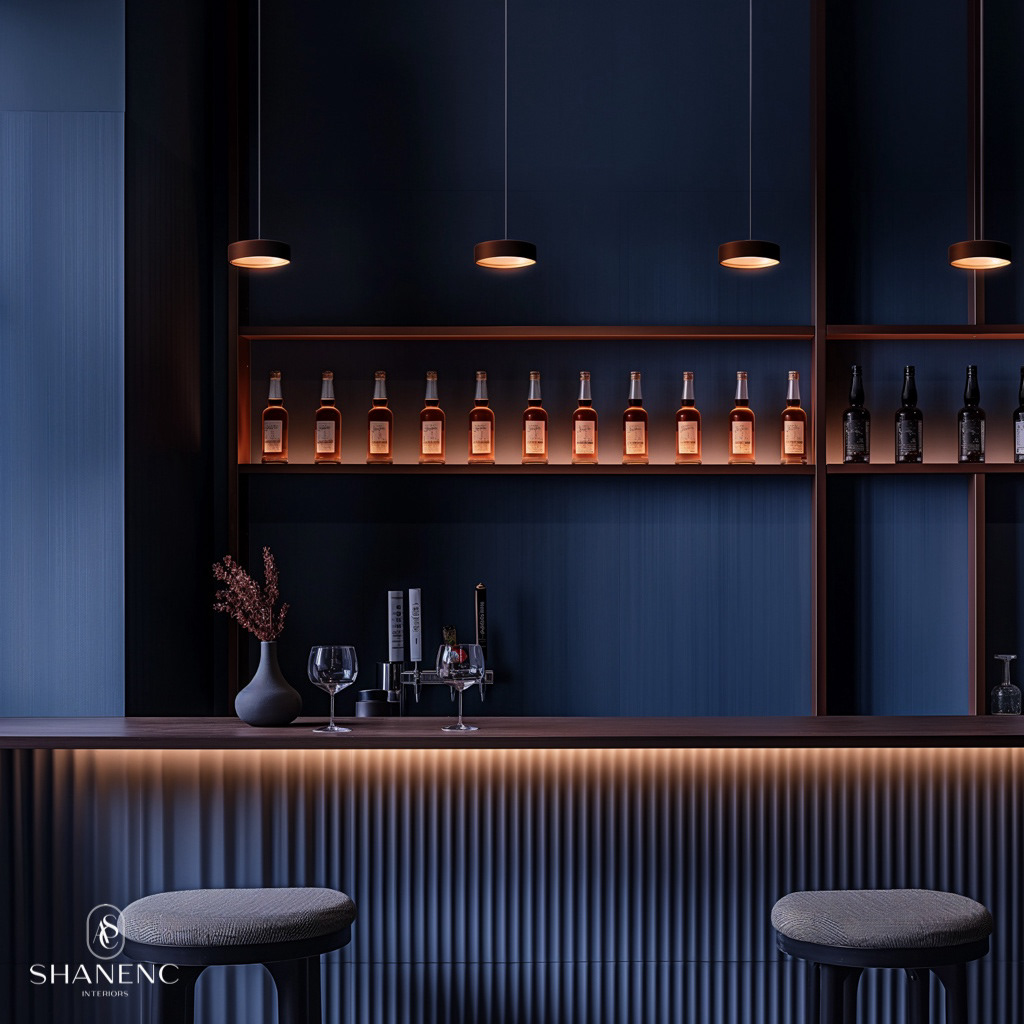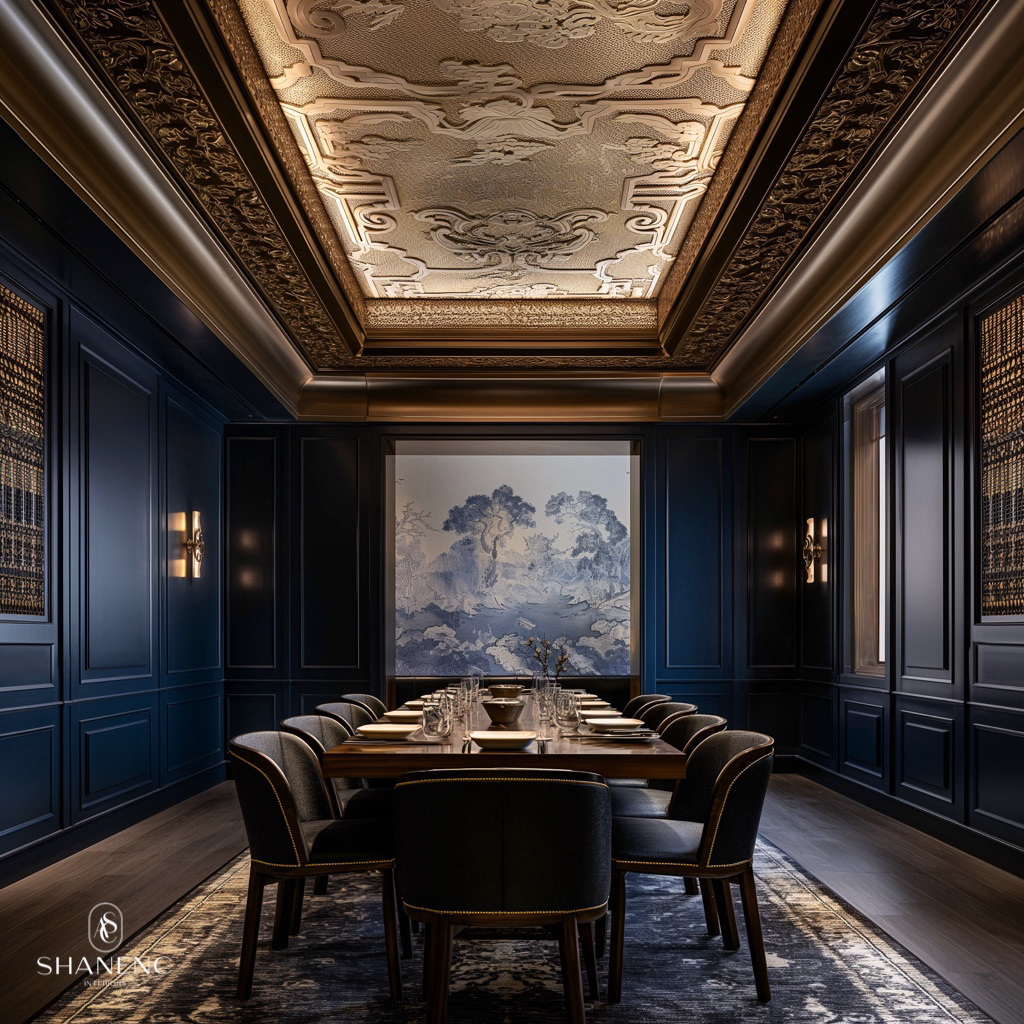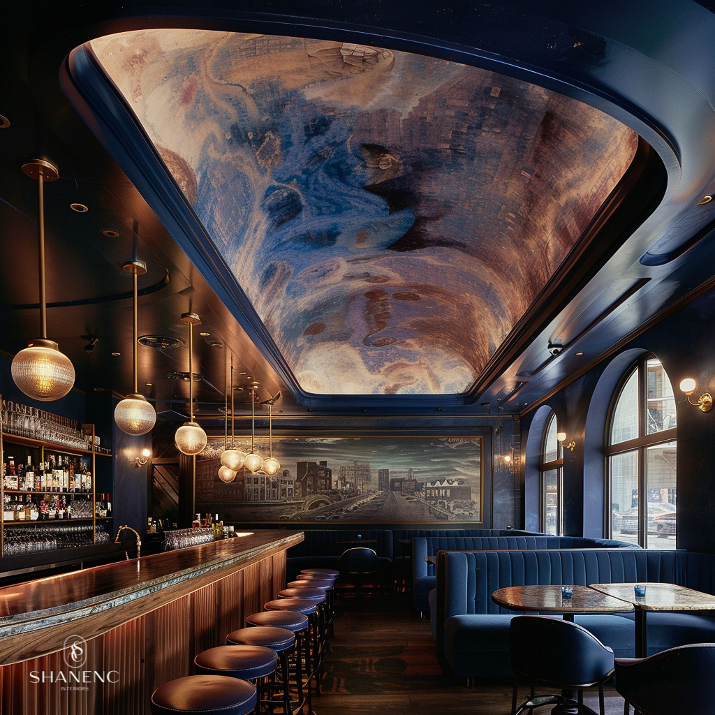 Conceptual Design — This restaurant's design features a rich, moody color palette of deep blues, warm wood tones, and metallic accents, creating an intimate and inviting atmosphere. The dramatic ceiling, adorned with intricate textures and hand-painted artwork, draws the eye upward and encourages conversation. Organic shapes and curved furnishings complement the sculptural lighting, creating a sense of balance and movement throughout the space. Luxurious woods, textured panels, and artisan-crafted finishes are selected to evoke warmth and sophistication, seamlessly blending functionality with a refined aesthetic. Every detail showcases craftsmanship, providing guests with an unforgettable sensory and dining experience.
